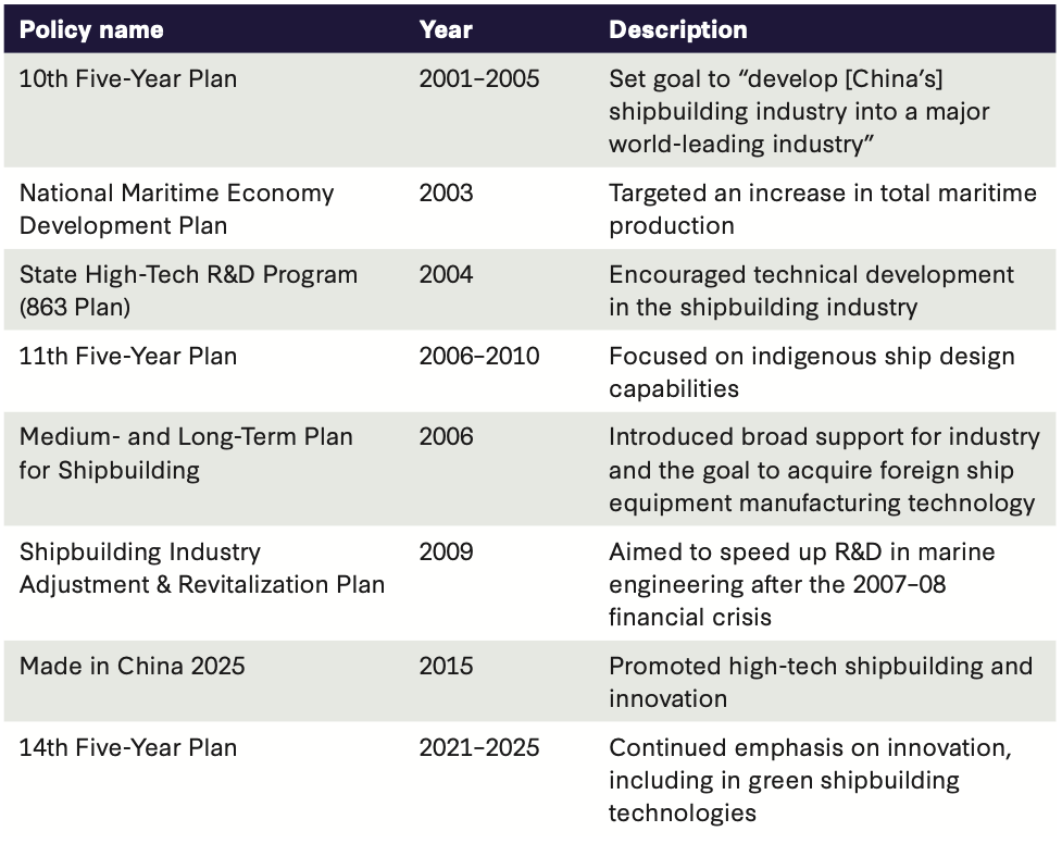 The emphasis given to the shipbuilding industry by the Chinese government is evident in the title “Pillar Industry” designated to it in both the 11th (2006-10) and the 12th (2011-15) National 5-Year Plans (Funaiole et al., 2025).